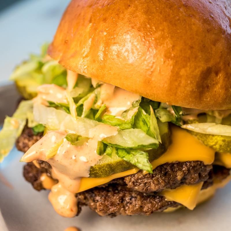 Fresh patties + bacon + sunny side up egg + American cheese + crispy fried onions + lettuce + tomatoes + bacon aioli. Add fries (+$2.00)