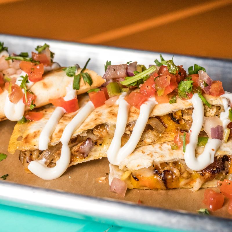 Crafted Quesadilla Tray (serve 10-12 ppl) • Our chicken quesadilla consists of: Pollo Asado Chicken, Caramelized Onions, Mixed Bell Peppers, Shredded Cheese Blend, Crema, Pico De Gallo, Cilantro, Flour Tortilla.