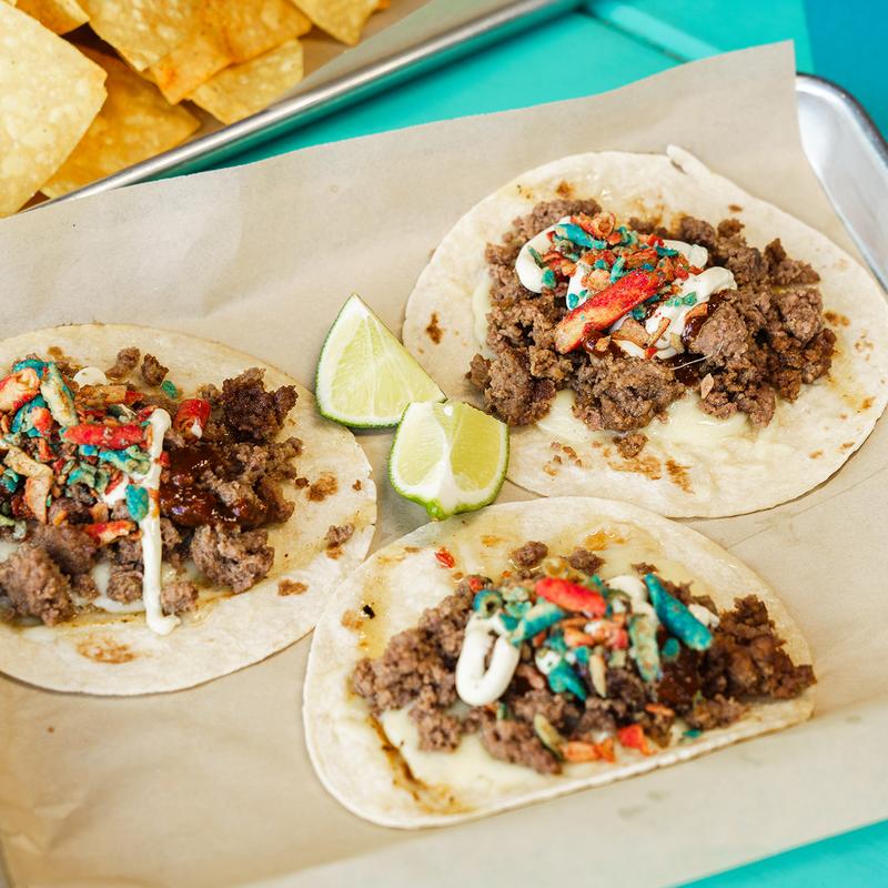 Ground beef, shredded cheese, Dude Seriously sauce, Takis, flour tortilla