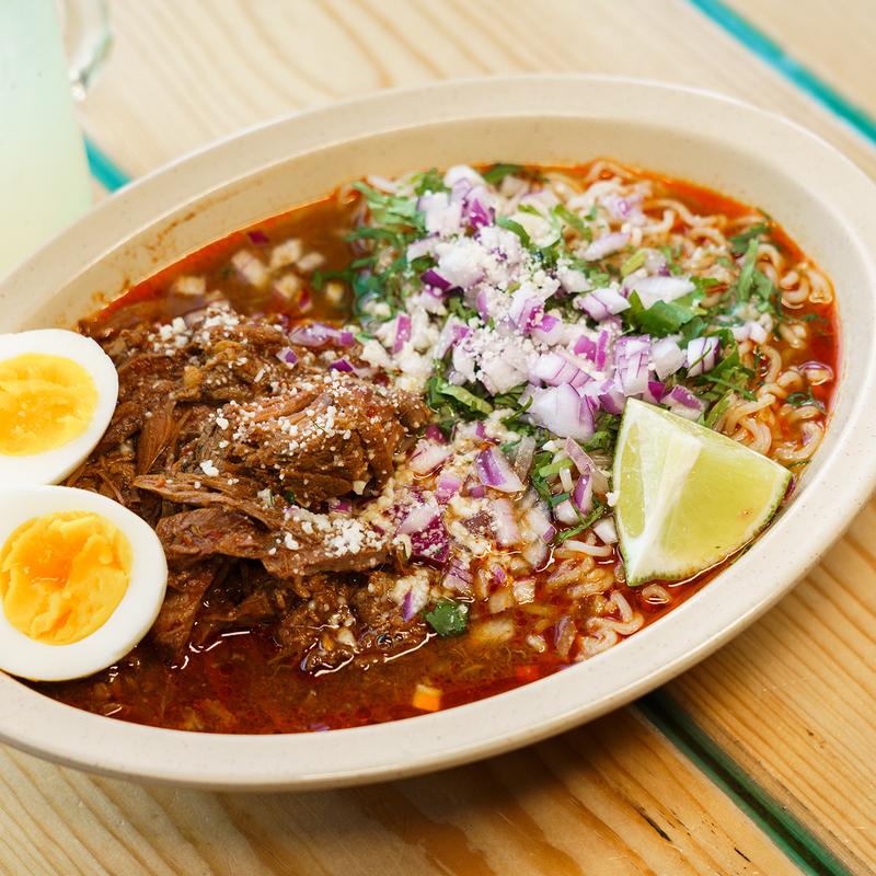Braised beed barbacoa, ramen noodles, soft boiled egg, beef broth, onions, cilantro